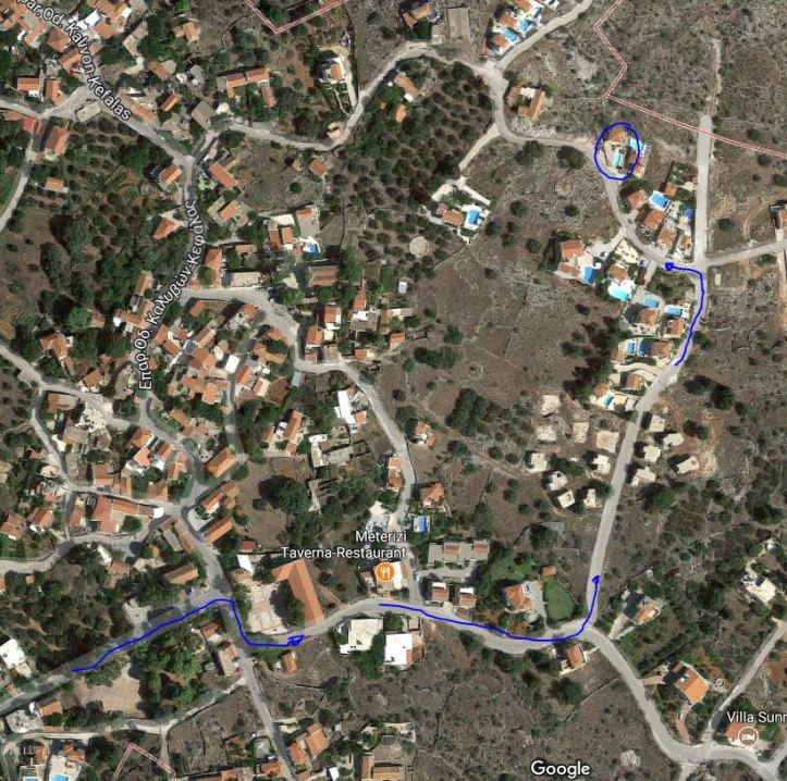 Kjør 50 meter forbi tavernaen og ta første vei nedover til venstre… ved enden av muren på bildet over…