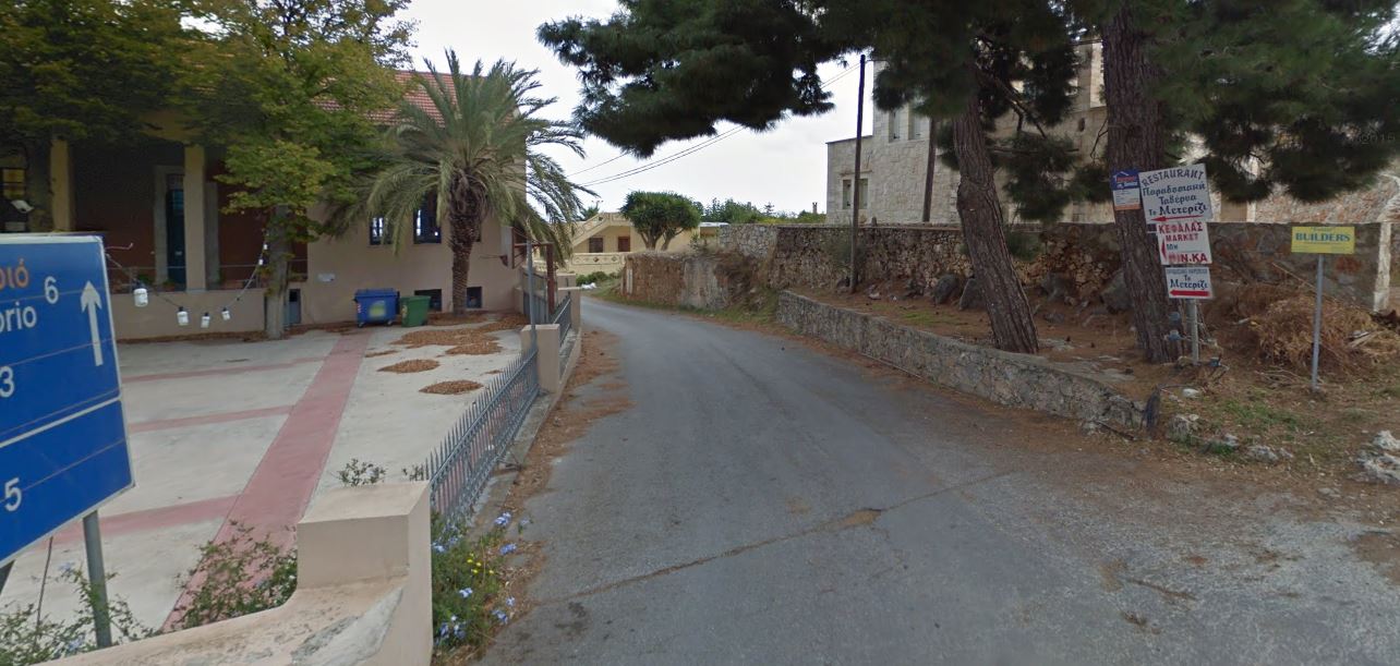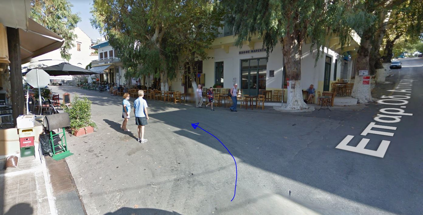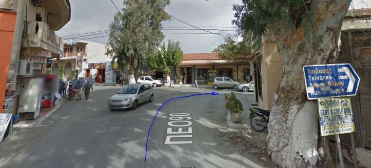 Alternativt – isteden for å ta av til venstre ved Kefalas skiltet – kjør 100 meter rett fram og ta så til venstre i krysset der man har apoteket på høyre hånd og der man ser tavernaen med stoler og bord på fortauet (se bildet over). Her starter veien til Kefalas. Følg denne rett fram.