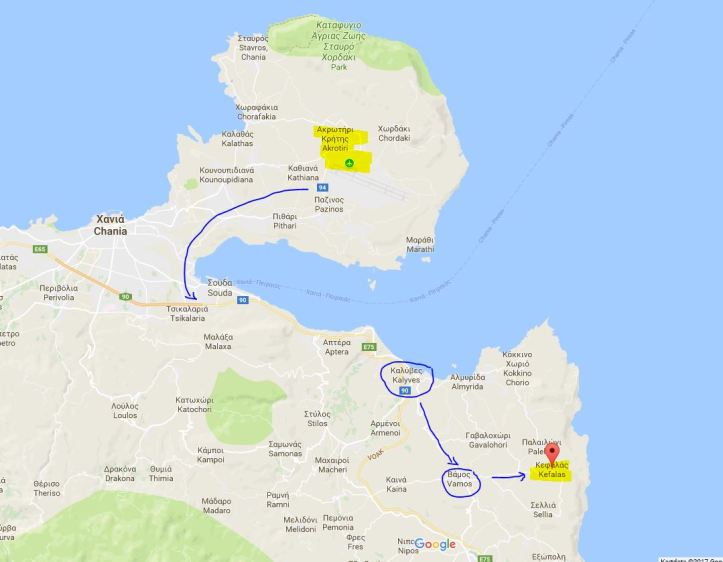 National Road går fra Kissamos vest for Chania til Iraklion. Denne veien må man ut på (retning østover) for å komme til Kalyves, Vamos og Kefalas.